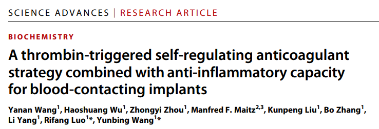 近期,国家生物医学材料工程技术研究中心王云兵教授团队,围绕心血管植介入器械植入后面临的组织反应为出发点,以内皮细胞表面血栓调节蛋白的自调节抗凝功能为灵感,结合材料植入后的全过程抗炎功能需求,提出了一种辅助心血管植介入材料表面再内皮化的新思路,即一种结合抗炎功能的凝血酶敏感自调节抗凝涂层改性新策略。在材料表面没有实现正常内皮覆盖的早期阶段,这种涂层有望代替并行使部分内皮细胞的血栓调节蛋白抗凝血功能,从而抑制材料早期剧烈的凝血反应,同时配合全过程的抗炎保护,为后续的器械表面再内皮化进程提供良好微环境保障。相关成果发表在国际知名综合性期刊Science Advances上(2022, 8, 9, eabm3378),国家生物医学材料工程技术研究中心/成人视频