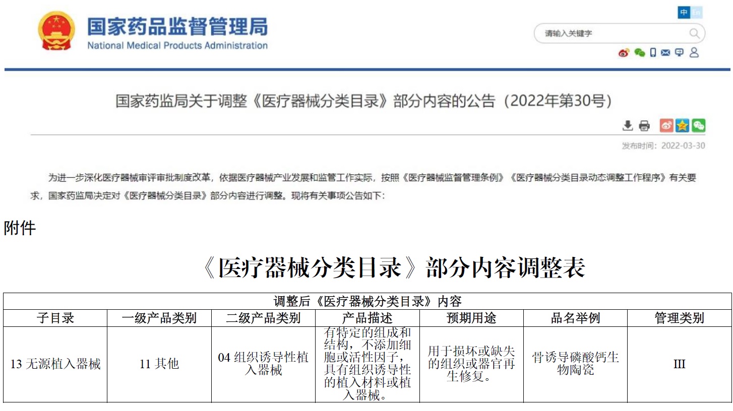 近日,国家药品监督管理局颁布2022年第30号公告,对《医疗器械分类目录》部分内容进行调整,“组织诱导性植入器械”,作为新添加的子目录(13-11-04) 被正式列入。这是张兴栋院士及其团队继2018年将“组织诱导性生物材料”经国际生物材料定义共识会投票通过,被列入“21世纪生物材料定义”;2021年通过立项申请、形成报批稿并已在批准过程中的“骨诱导磷酸钙生物陶瓷” 国家推荐标准后;在“组织诱导性生物材料产品”监管科学领域中再次取得的国际原创成果!