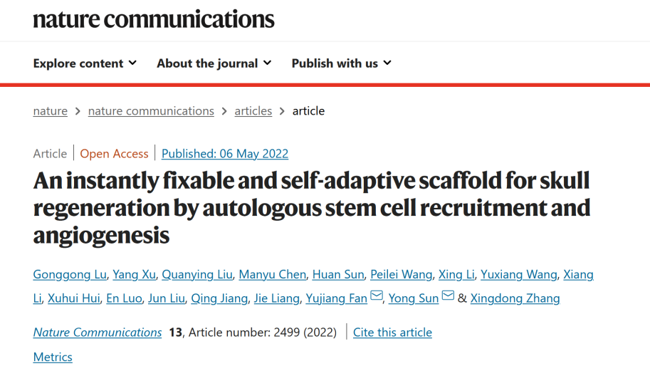 近日,张兴栋院士团队樊渝江教授和孙勇研究员课题组在Nature Communications上发表题为“An instantly fixable and self-adaptive scaffold for skull regeneration by autologous stem cell recruitment and angiogenesis”的研究论文。论文共同第一作者为博士后卢恭恭、博士生徐扬;华西医院神经外科惠旭辉教授,华西口腔医院颌面外科罗恩教授,生医成人视频