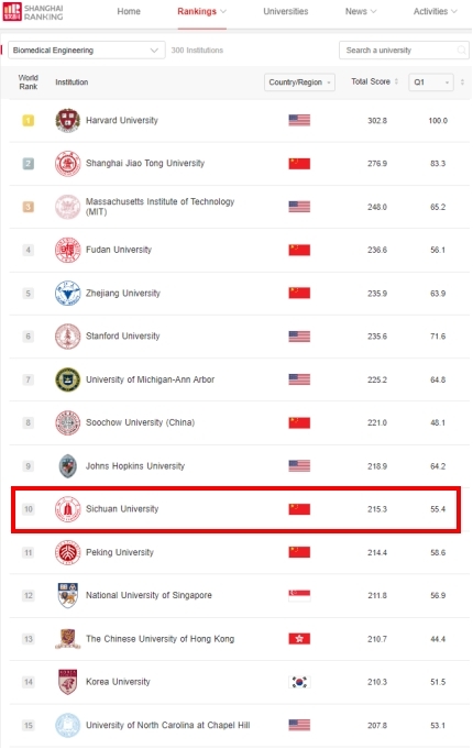 生物医学工程学科获得215.3总分,较2021年上升3位,位列世界第10位。
