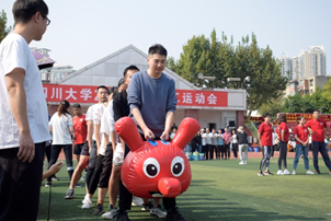 抛球入筐需要老师们将手上的球精确地投入面前的小筐内,不同于投篮,这里的小筐背负在队友的身上,这极大地考验了老师们的默契,老师们需要在心中计算出投掷的力度和高度才能保证小球顺利进入筐内,团队总计数的形式也给比赛增添了更多的配合。老师们一个接一个进球时开心的呐喊、差一点但绝不气馁的鼓励,化作了运动场上最美的交响乐。