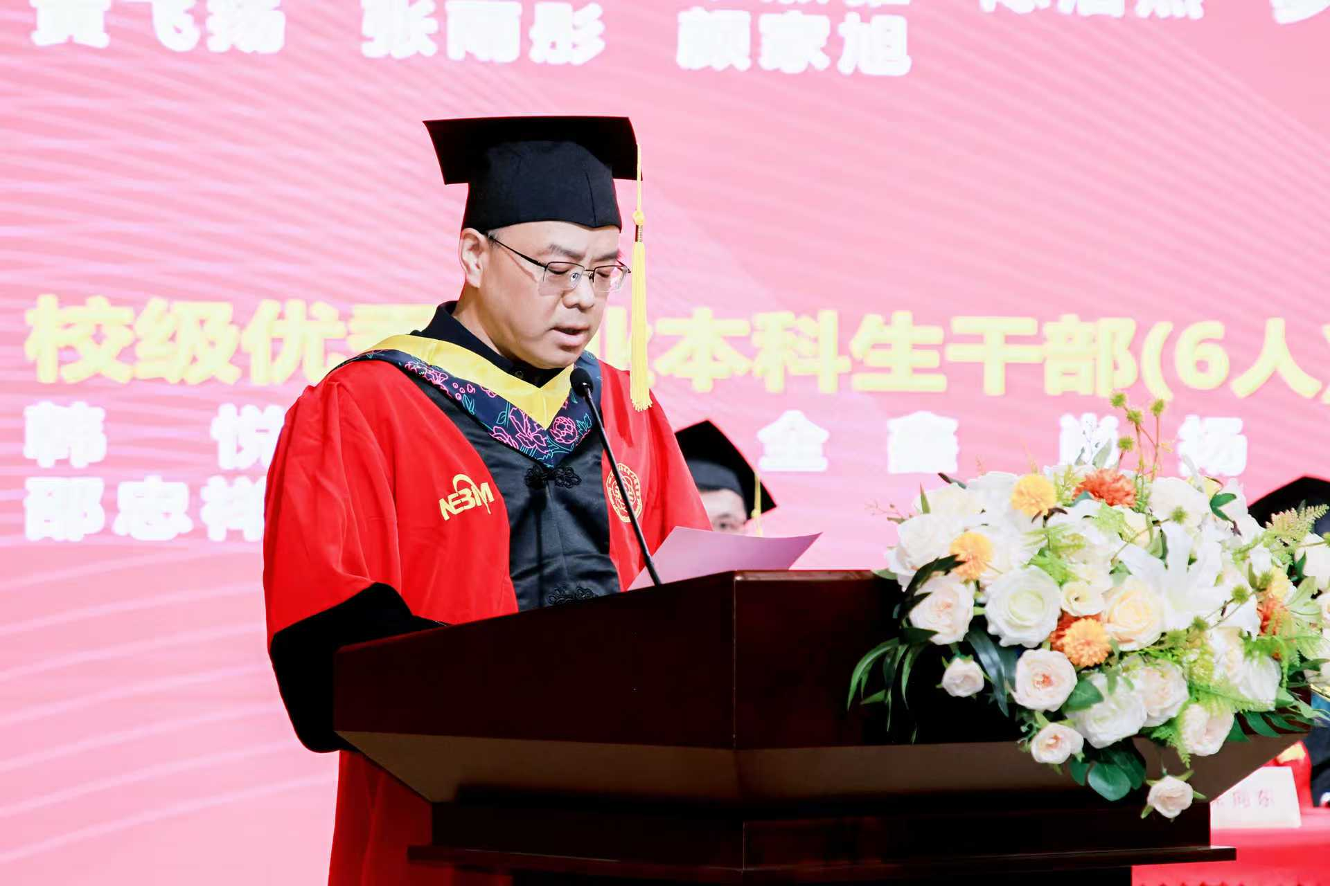 创造的优质平台,更要以“十年磨一剑”的定力攻坚克难,用勤奋与智慧书写科技报国的青春答卷;三是涵养阳光心态,拥抱多彩人生。希望同学们在追求卓越的同时,保持对生活的热爱与从容,在快节奏的时代中修炼身心、平衡成长;四是秉持感恩之心,践行责任担当。无论身处何方,都要以谦逊姿态回馈社会,在共享成果中传递温暖,让科技之光照亮更多生命。王云兵勉励全院毕业生在今后的日子里能够勇立潮头,以今日之耕耘,铸明日之辉煌!