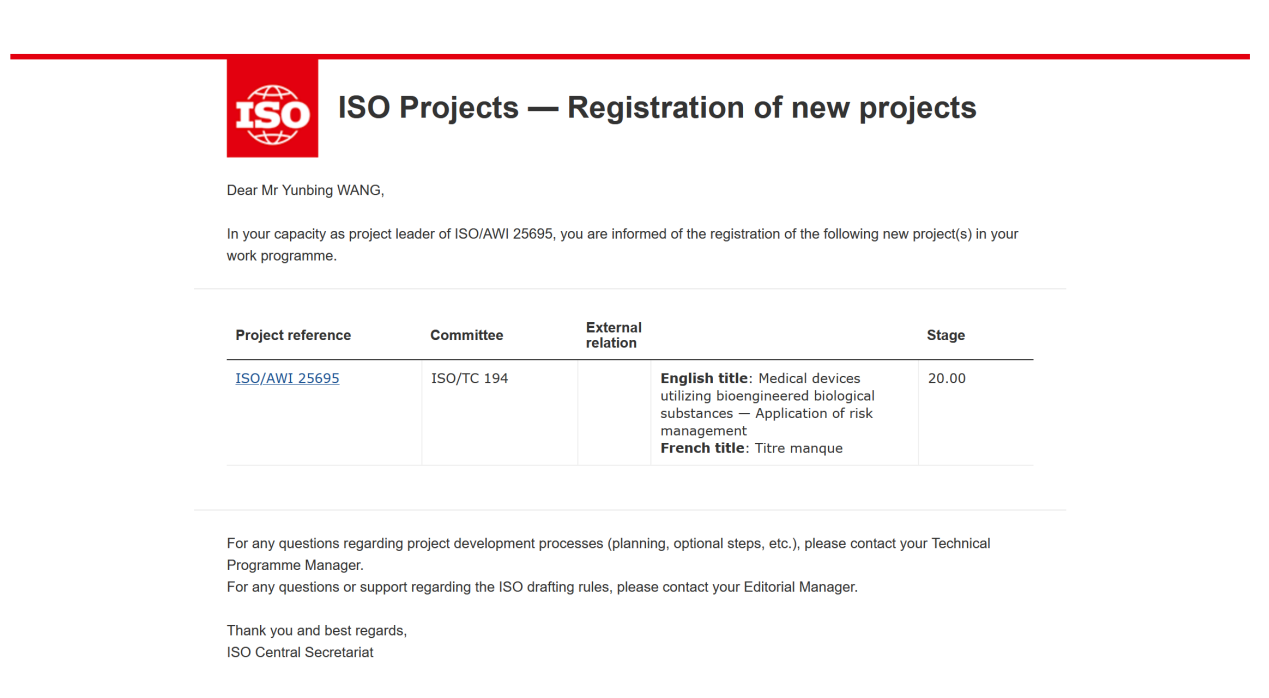 和山西锦波生物医药股份有限公司联合牵头的国际标准提案《利用生物工程生物物质制备的医疗器械-应用风险管理》(英文:Medical devices utilizing bioengineered biological substances--Application of risk managemen)正式通过国际标准化组织医疗器械生物学和临床评价标准化技术委员会(ISO/TC194)的立项评审。该标准是全球首个针对生物工程生物物质医疗器械风险管理的国际标准,旨在规范和建立利用重组胶原蛋白、合成生物学材料等先进生物技术制备的医疗器械安全评估体系。成人视频王云兵教授担任项目组组长进行答辩汇报。此次立项成功,体现了国际社会对我国在该领域技术积累和标准化能力的认可,也为我国未来在生物医药产业的国际竞争中争取更大话语权奠定了基础。