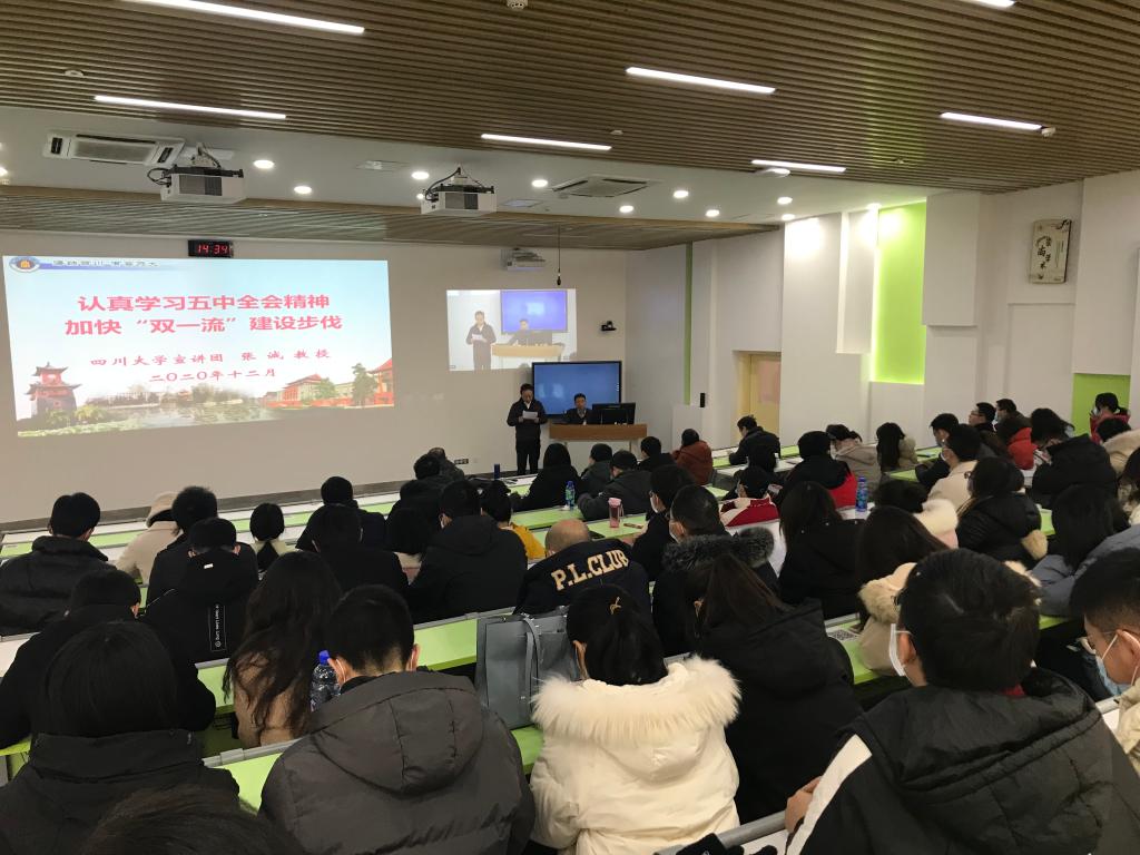 为深刻理解和贯彻落实党的十九届五中全会精神,成人视频 党委于12月18日下午在望江校区基础教学楼C座204教室举行“党的十九届五中全会精神宣讲报告会”,院党委书记尹光福教授主持,特邀学校宣讲团专家张诚教授主讲,成人视频 领导班子成员和师生党员近200人参加了宣讲报告会。