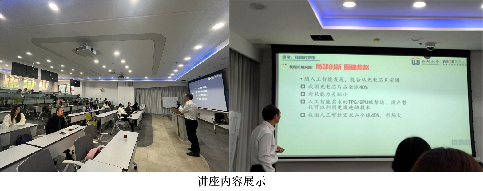 在讲座中,李西军教授特别强调了我国在芯片产业的现状和突围策略。他讲到我国在光电芯片和芯片封装领域与国际最先进技术差异小,但在人工智能需求的TPG/GPU技术包括相应的先进封装方面仍存在一定的差距。同时,也提到了我国在芯片设计软件、原材料、制造装备、芯片制造工艺等方面的不足,并指出“拿市场换技术是不现实的,要根据芯片产业未来发展的技术需求,提前突破产业链上的关键技术,获得与国际巨头的平等对话权,重新进入全球产业体系。”。